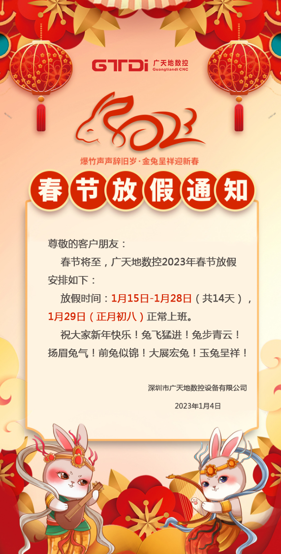 2023年春节将至,首先感谢您在2022年里的鼎力支持和愉快合作,多宝电竞|体育数控全体同仁在此给您拜个早年。在新年的一年里,多宝电竞将更加努力,为您提供更优质的服务。按照国家春节放假规定结合我司的具体情况,春节放假时间安排如下: